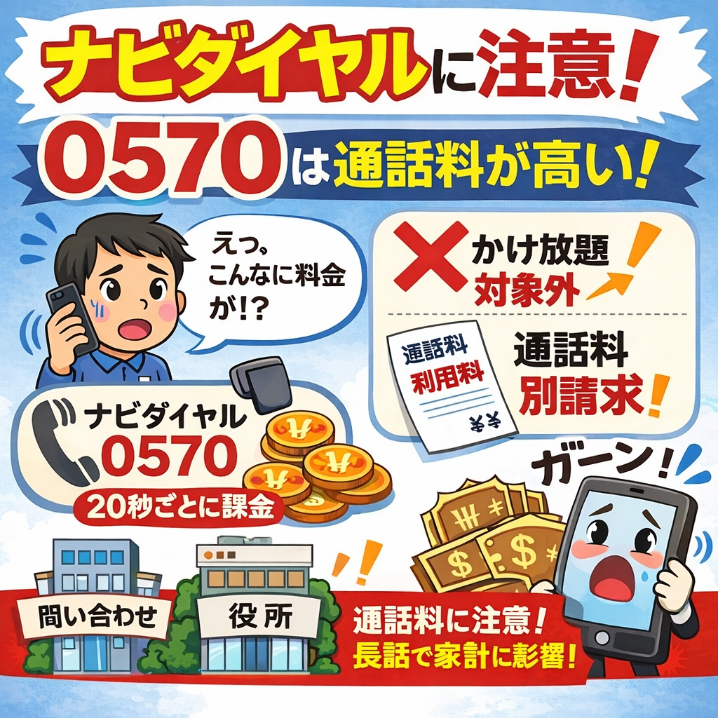 ナビダイヤル(0570)って 意外と知られていませんが、通話料が高いです。 しかも厄介なのがこれ。 かけ放題の対象外。 普段「かけ放題だから大丈夫」と思って 何も気にせず電話していると、 後から 別請求で通話料が発生しま […]